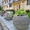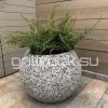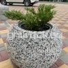 Высокопрочный бетон марки М350. Повышенная морозостойкость F300. Каменная крошка не налеплена сверху, а целиком находится в массе изделия. Снизу имеется дренажное отверстие. Можно сажать небольшие деревья. Вазон является антивандальным.