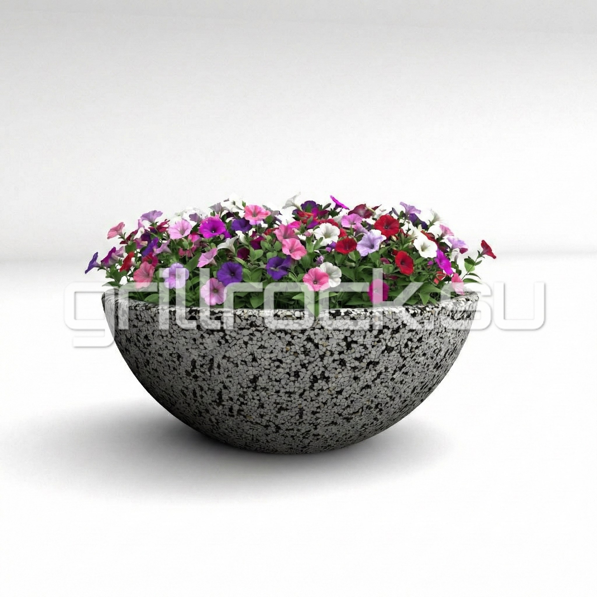 Вазон “Чаша” прекрасно вписывается в любую архитектуру современного города. Изготовлен из смеси высокопрочного архитектурного бетона (марка М350, морозостойкость F300) и натурального камня (серый, чёрный и белый мрамор, «шахматка», красный гранит, Питерский (Московский) гравий). Каменная крошка не наклеена сверху, а находится в составе изделия (фракция от 3 до 15 мм).