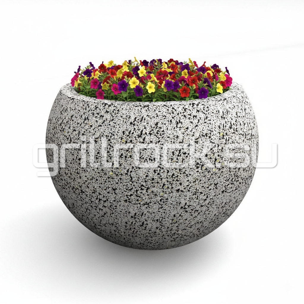 Вазон “Глобус” прекрасно вписывается в любую архитектуру современного города. Изготовлен из смеси высокопрочного архитектурного бетона (марка М350, морозостойкость F300) и натурального камня (серый, чёрный и белый мрамор, «шахматка», красный гранит, Питерский (Московский) гравий). Каменная крошка не наклеена сверху, а находится в составе изделия (фракция от 3 до 15 мм).