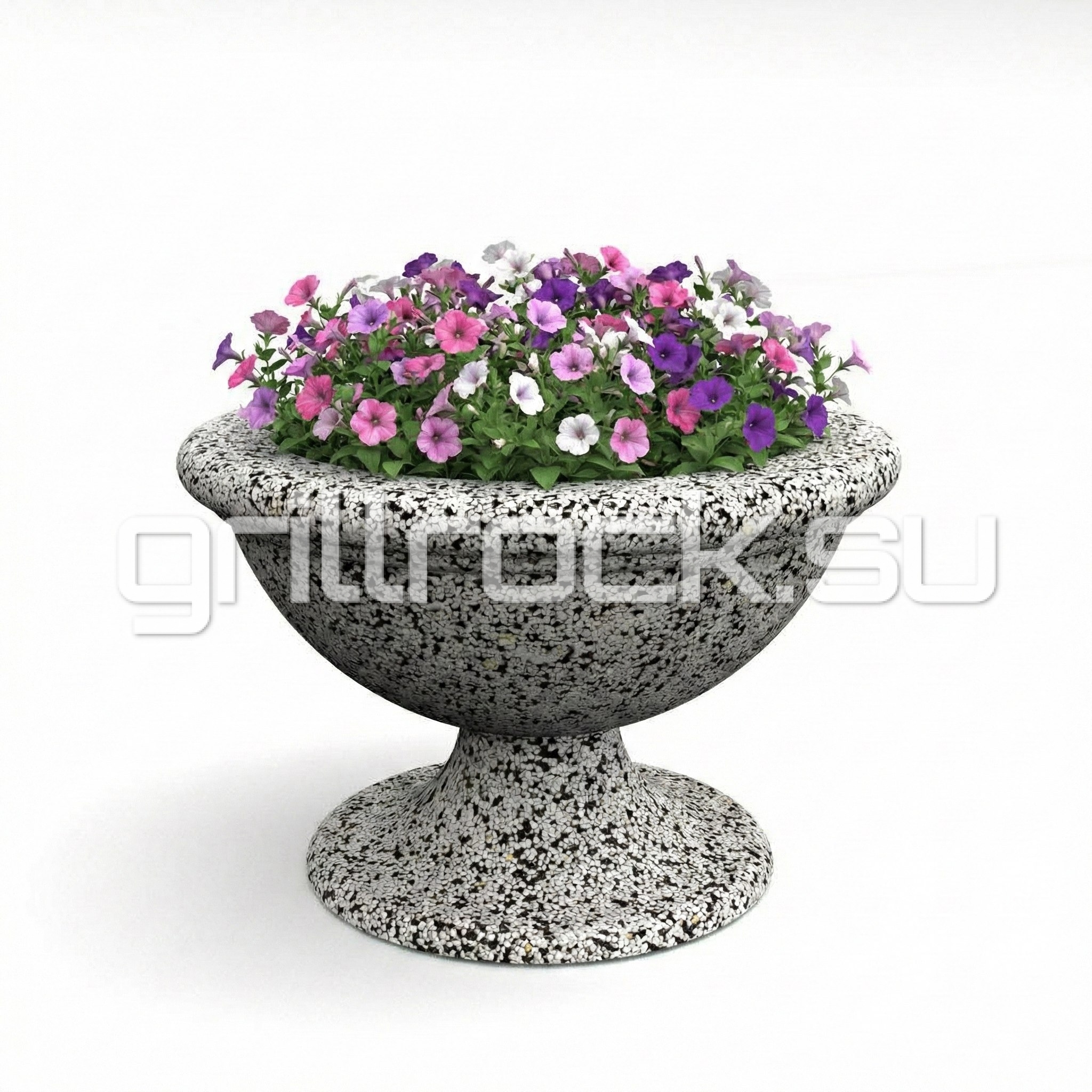 Вазон “Ламелла” прекрасно вписывается в любую архитектуру современного города. Изготовлен из смеси высокопрочного архитектурного бетона (марка М350, морозостойкость F300) и натурального камня (серый, чёрный и белый мрамор, «шахматка», красный гранит, Питерский (Московский) гравий). Каменная крошка не наклеена сверху, а находится в составе изделия (фракция от 3 до 15 мм).