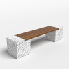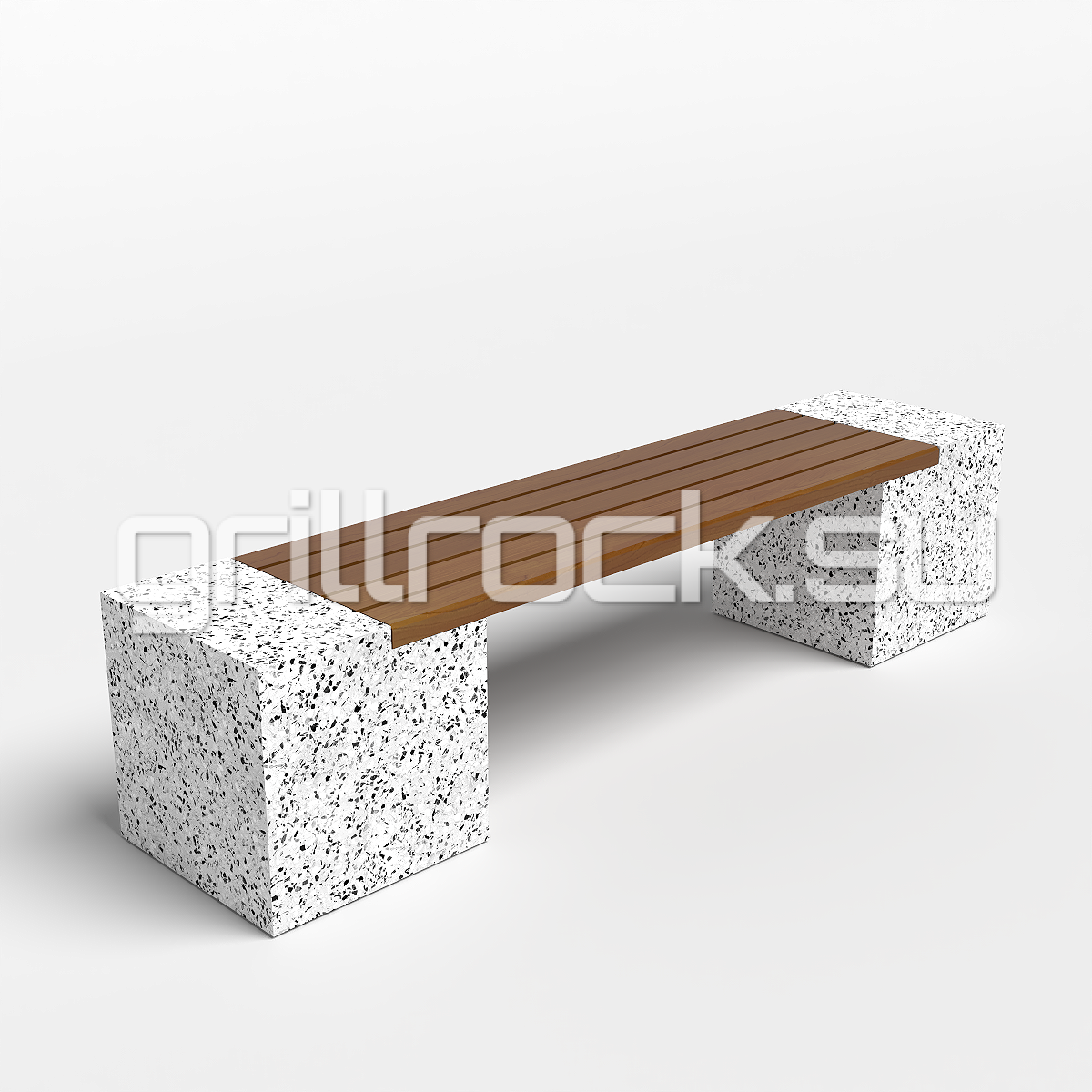 Высокопрочный бетон марки М350. Повышенная морозостойкость F300. Каменная крошка не налеплена сверху, а целиком находится в массе изделия. Древесина: брус – обработана импортным покрытием с антисептиком. Скамейка является антивандальной.