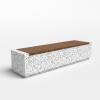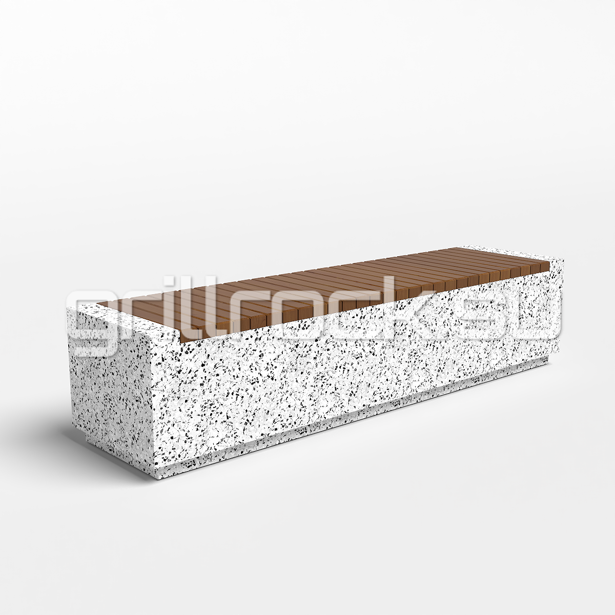 Высокопрочный бетон марки М350. Повышенная морозостойкость F300. Каменная крошка не налеплена сверху, а целиком находится в массе изделия. Древесина: брус – обработана импортным покрытием с антисептиком. Скамейка является антивандальной.