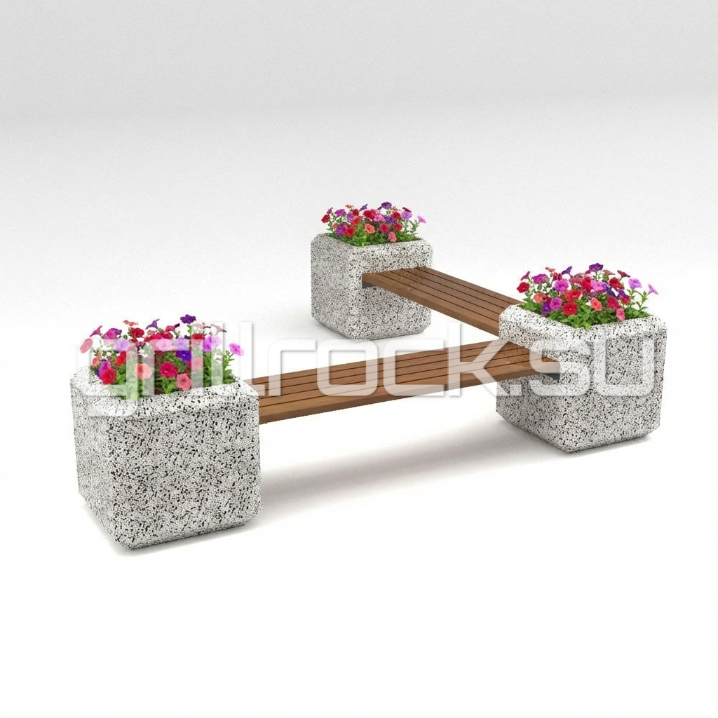 Скамейка “Барбара” с вазонами дабл прекрасно вписывается в любую архитектуру современного города. Изготовлена из смеси высокопрочного архитектурного бетона (марка М350, морозостойкость F300) и натурального камня (серый, чёрный и белый мрамор, «шахматка», красный гранит, Питерский (Московский) гравий). Каменная крошка не наклеена сверху, а находится в составе изделия (фракция от 3 до 15 мм). Рейки выполнены из дерева, пропитаны импортным раствором с антисептиком.