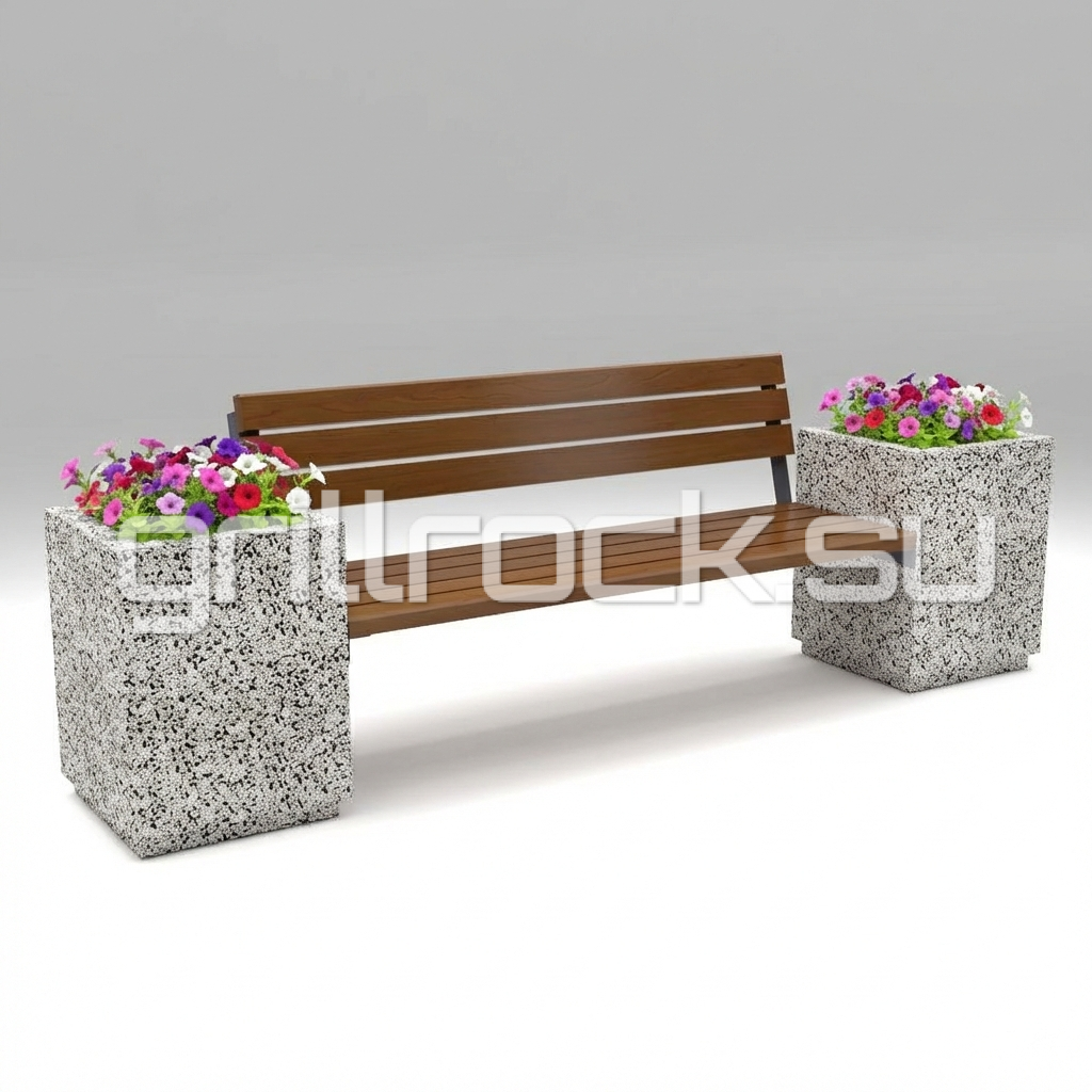 Скамейка со спинкой и вазонами (цветочницами) прекрасно вписывается в любую архитектуру современного города. Изготовлена из смеси высокопрочного архитектурного бетона (марка М350, морозостойкость F300) и натурального камня (серый, чёрный и белый мрамор, «шахматка», красный гранит, Питерский (Московский) гравий). Каменная крошка не наклеена сверху, а находится в составе изделия (фракция от 3 до 15 мм). Рейки выполнены из дерева, пропитаны импортным раствором с антисептиком.