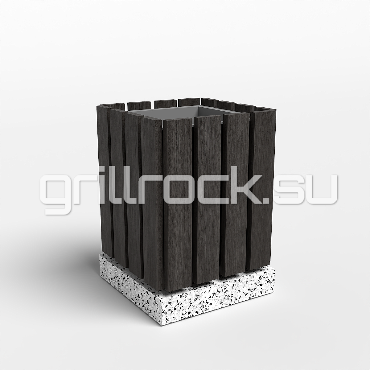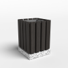 Высокопрочный бетон марки М350. Повышенная морозостойкость F300. Каменная крошка не налеплена сверху, а целиком находится в массе изделия. Внутри имеется съемный оцинкованный вкладыш. Рейки выполнены из ДПК (древесно-полимерного композита). Урна является антивандальной.