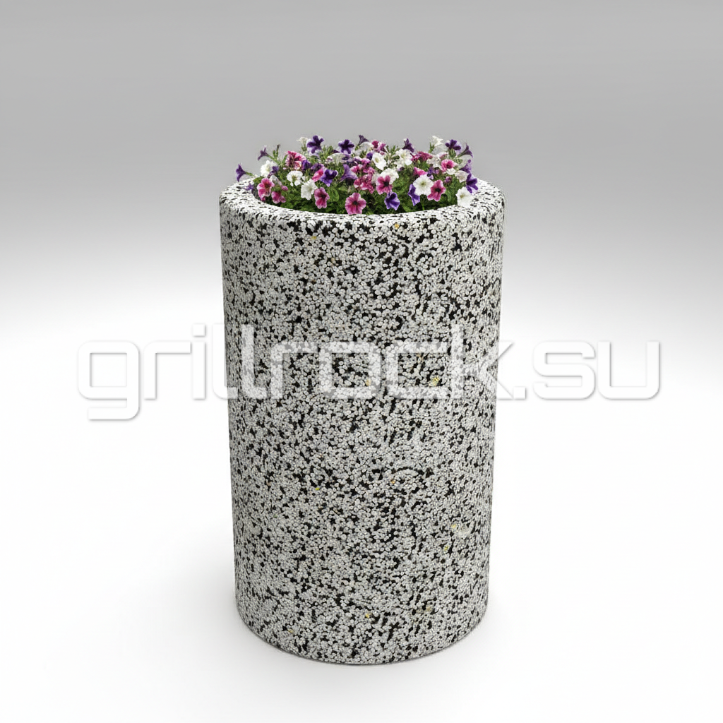 Вазон “Афина” прекрасно вписывается в любую архитектуру современного города. Изготовлен из смеси высокопрочного архитектурного бетона (марка М350, морозостойкость F300) и натурального камня (серый и белый мрамор, «шахматка», Питерский (Московский) гравий, красный гранит, златолит, Чёрный мрамор (андезит)). Каменная крошка не наклеена сверху, а находится в составе изделия (фракция от 3 до 15 мм).