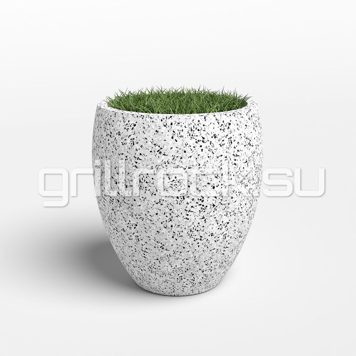 Вазон “Бутон” прекрасно вписывается в любую архитектуру современного города. Изготовлен из смеси высокопрочного архитектурного бетона (марка М350, морозостойкость F300) и натурального камня (серый, чёрный и белый мрамор, «шахматка», красный гранит, Питерский (Московский) гравий). Каменная крошка не наклеена сверху, а находится в составе изделия (фракция от 3 до 15 мм). Подходит для посадки туи (хвойников), кустарников и деревьев небольшого размера.