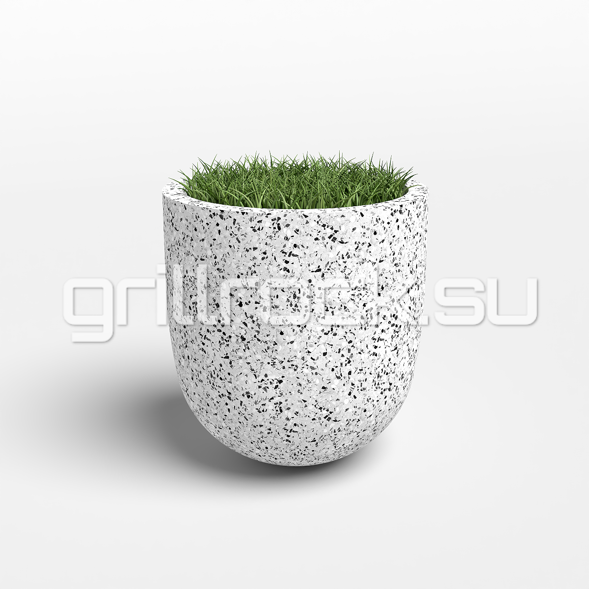 Вазон “Джаз” прекрасно вписывается в любую архитектуру современного города. Изготовлен из смеси высокопрочного архитектурного бетона (марка М350, морозостойкость F300) и натурального камня (серый, чёрный и белый мрамор, «шахматка», красный гранит, Питерский (Московский) гравий). Каменная крошка не наклеена сверху, а находится в составе изделия (фракция от 3 до 15 мм). Подходит для посадки туи (хвойников), кустарников и деревьев небольшого размера.