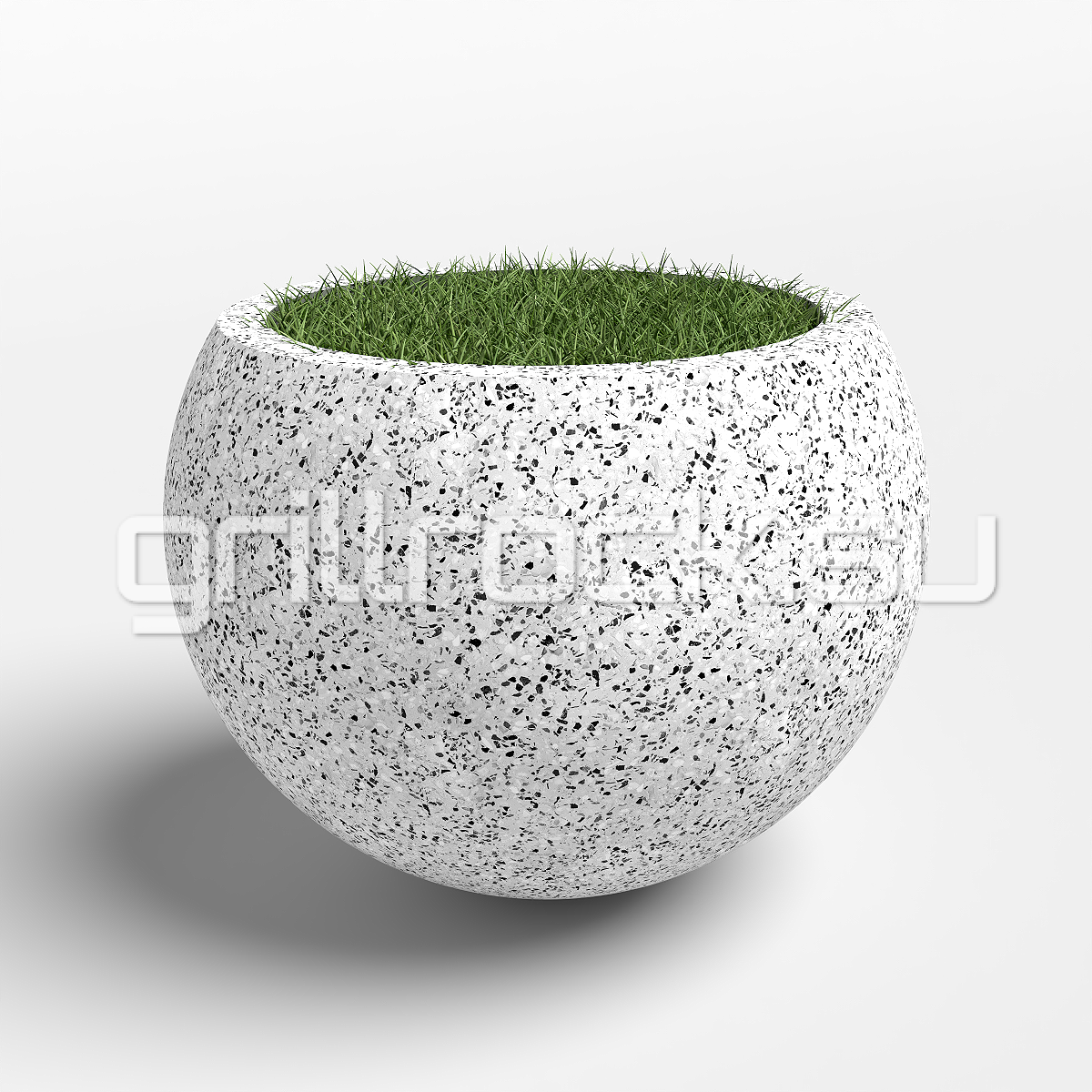 Вазон “Глобус” прекрасно вписывается в любую архитектуру современного города. Изготовлен из смеси высокопрочного архитектурного бетона (марка М350, морозостойкость F300) и натурального камня (серый, чёрный и белый мрамор, «шахматка», красный гранит, Питерский (Московский) гравий). Каменная крошка не наклеена сверху, а находится в составе изделия (фракция от 3 до 15 мм).