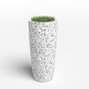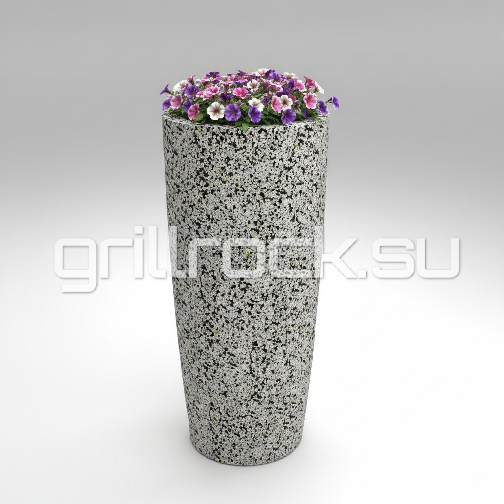 Вазон “Классик” прекрасно вписывается в любую архитектуру современного города. Изготовлен из смеси высокопрочного архитектурного бетона (марка М350, морозостойкость F300) и натурального камня (серый, чёрный и белый мрамор, «шахматка», красный гранит, Питерский (Московский) гравий). Каменная крошка не наклеена сверху, а находится в составе изделия (фракция от 3 до 15 мм).