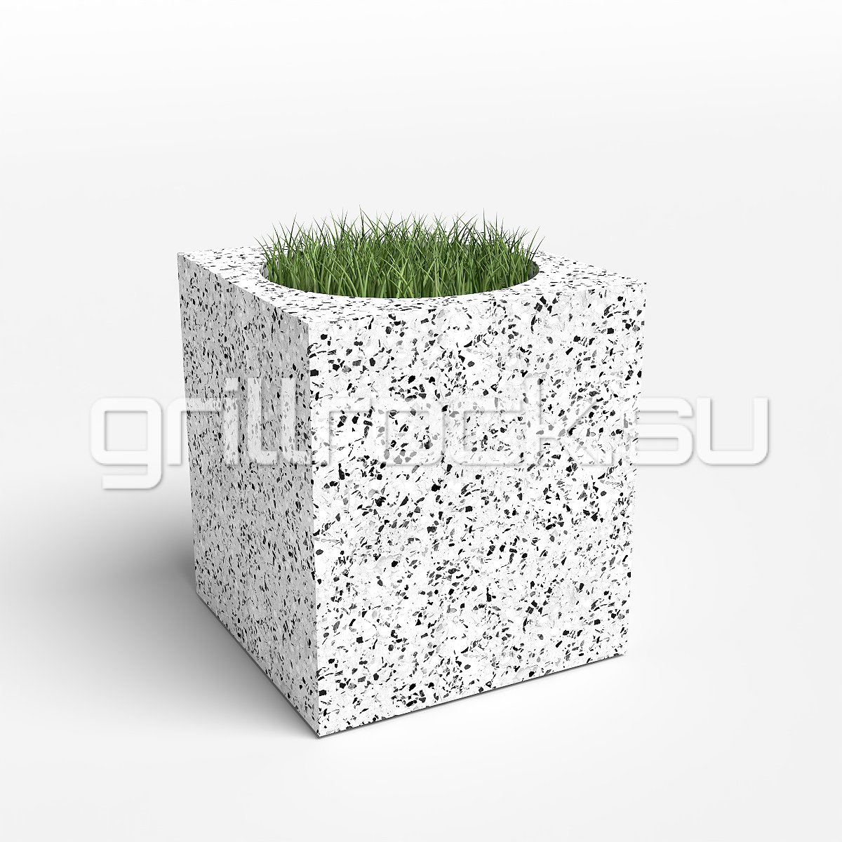 Вазон “Квадро” прекрасно вписывается в любую архитектуру современного города. Изготовлен из смеси высокопрочного архитектурного бетона (марка М350, морозостойкость F300) и натурального камня (серый и белый мрамор, «шахматка», Питерский (Московский) гравий, красный гранит, златолит, Чёрный мрамор (андезит)). Каменная крошка не наклеена сверху, а находится в составе изделия (фракция от 3 до 15 мм).