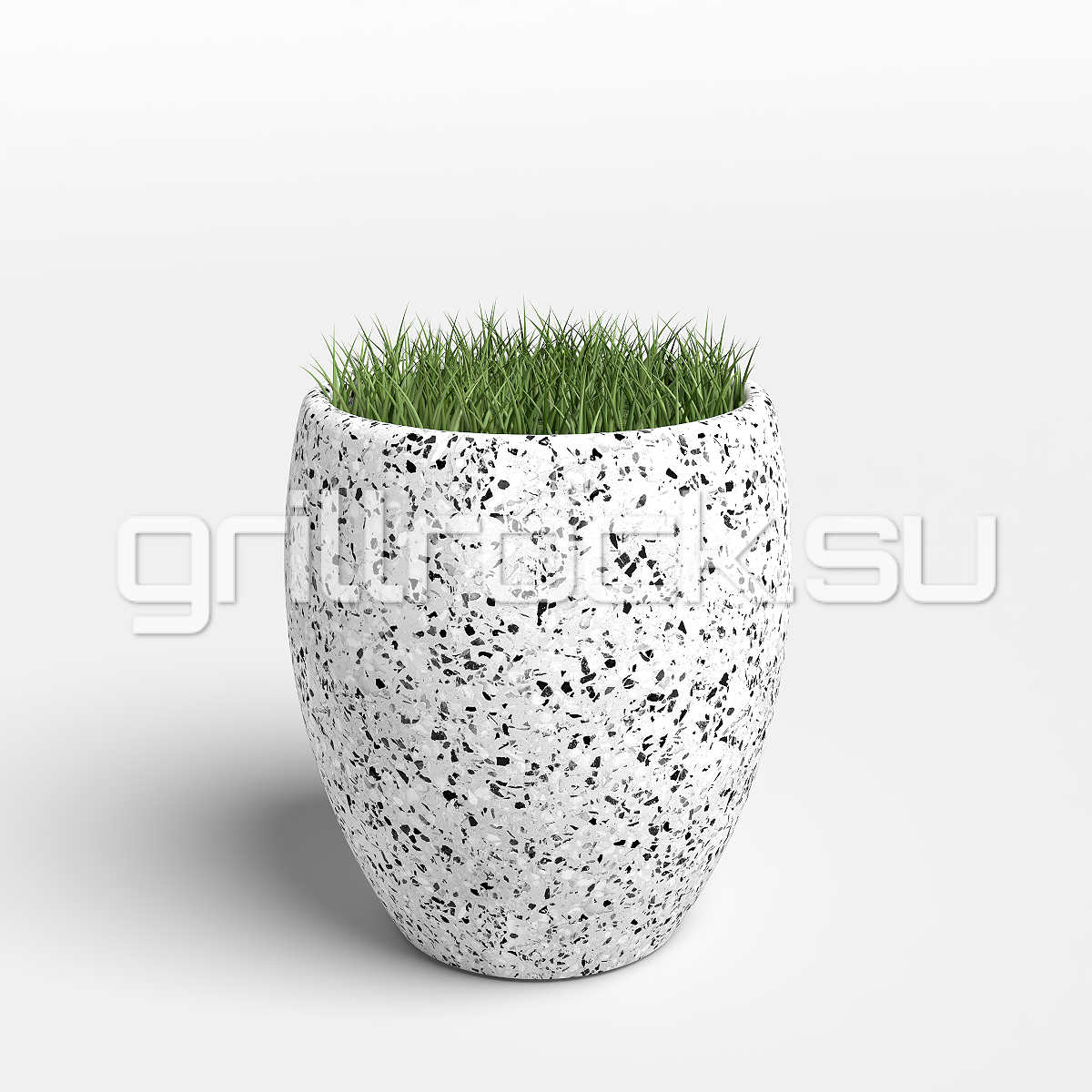 Вазон “Призма” прекрасно вписывается в любую архитектуру современного города. Изготовлен из смеси высокопрочного архитектурного бетона (марка М350, морозостойкость F300) и натурального камня (серый, чёрный и белый мрамор, «шахматка», красный гранит, Питерский (Московский) гравий). Каменная крошка не наклеена сверху, а находится в составе изделия (фракция от 3 до 15 мм).