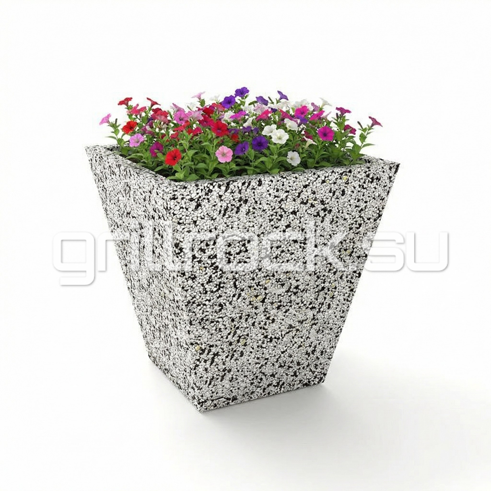 Вазон “Рига” прекрасно вписывается в любую архитектуру современного города. Изготовлен из смеси высокопрочного архитектурного бетона (марка М350, морозостойкость F300) и натурального камня (серый, чёрный и белый мрамор, «шахматка», красный гранит, Питерский (Московский) гравий). Каменная крошка не наклеена сверху, а находится в составе изделия (фракция от 3 до 15 мм). Подходит для посадки туи (хвойников), кустарников и деревьев небольшого размера.