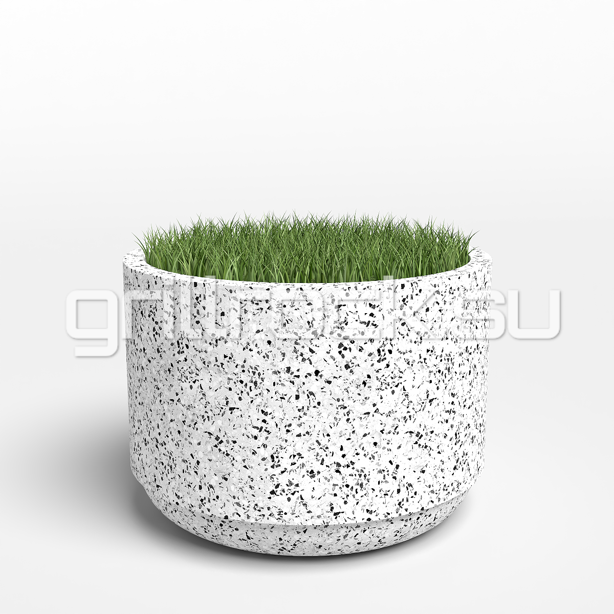 Вазон “Юрмала” прекрасно вписывается в любую архитектуру современного города. Изготовлен из смеси высокопрочного архитектурного бетона (марка М350, морозостойкость F300) и натурального камня (серый и белый мрамор, «шахматка», Питерский (Московский) гравий, красный гранит, златолит, Чёрный мрамор (андезит)). Каменная крошка не наклеена сверху, а находится в составе изделия (фракция от 3 до 15 мм).